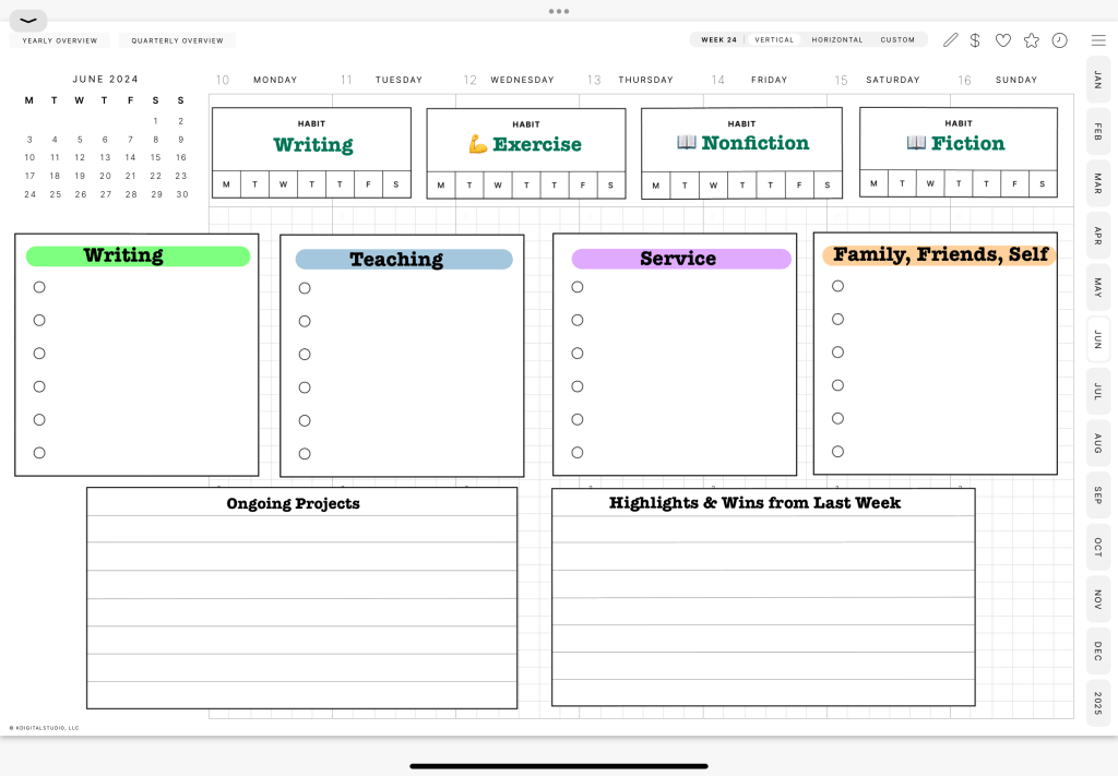 The Cyberry Digital Planner has three different weekly pages, but none really meshed with how I structured my weekly reviews or organize the type of information I want available at a glance. I ended up creating a Frankenstein’s monster of a page that is functional even if it leaves a lot to be desired aesthetically. Solving that problem made me one step closer to adopting the digital planner.